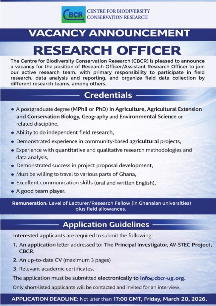 The Center for Biodiversity Conservation Research (CBCR) is pleased to announce the vacancy for the position for Research Officer/ Assistant Research Officer.